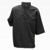 Cuello en V, corte delantero sesgado y dos bolsillos frontales, manga corta.
